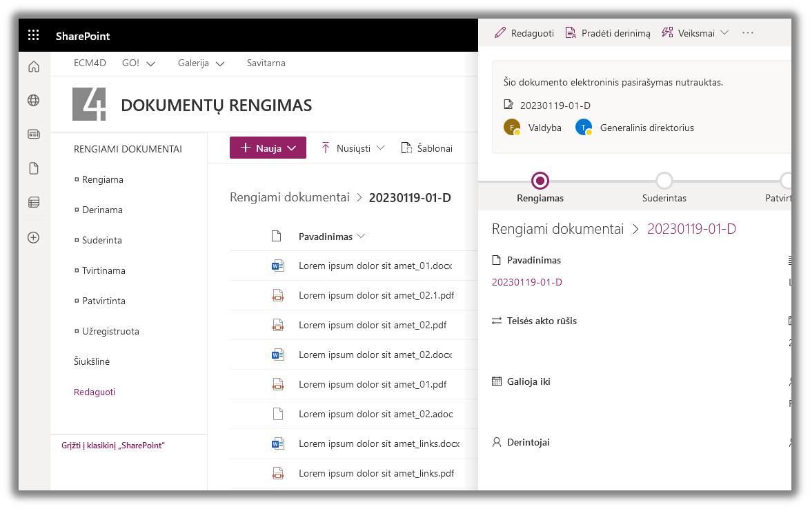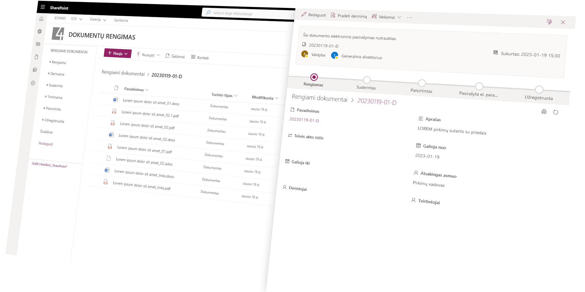 Dokumentų rengimas yra vienas svarbiausių veiklų įmonės biure. Šis modulis leidžia organizuoti dokumentų rengimą pagal numatytas taisykles, naudojant patvirtintus šablonus, ir peržiūrėti ir suderinti turinį komandos, departamento ar organizacijos lygyje. Integratuotas elektroninis dokumentų pasirašymas leidžia surinkti parašus tiek iš vidinių darbuotojų, tiek ir iš išorinių dalyvių.