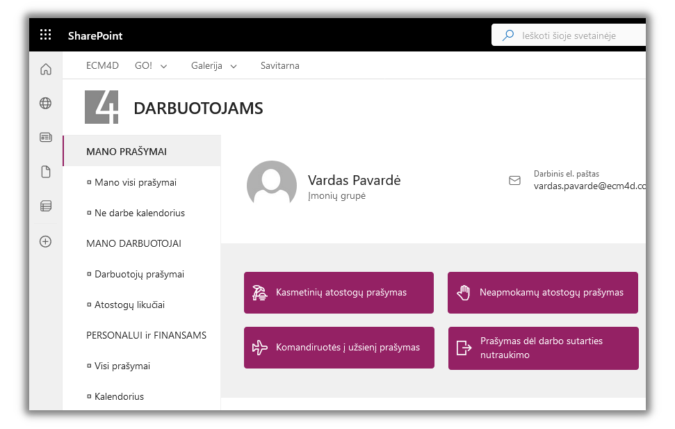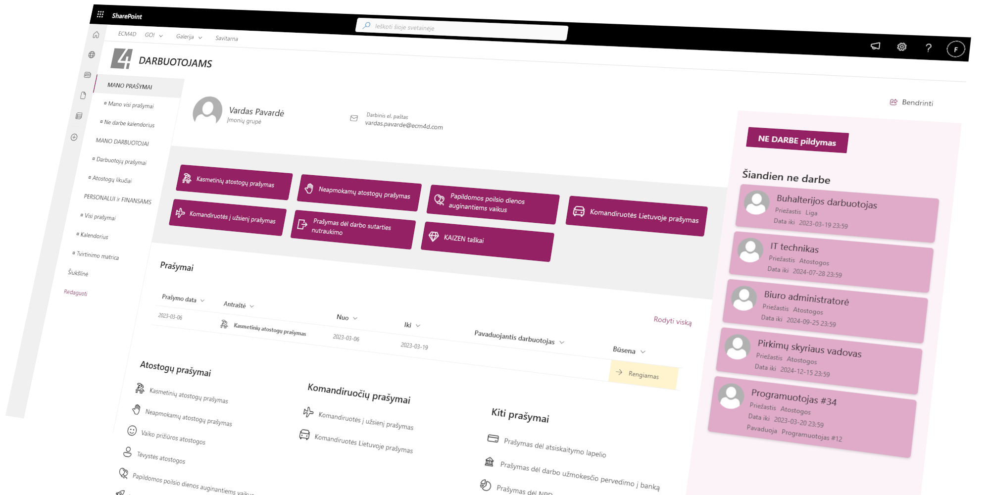 Savitarnos modulyje darbuotojai gali užpildyti įvairius prašymus - pradedant įprastais atostogų ar komandiruočių ir baigiant specializuotais, pvz. KAIZEN taškų ar automobilių stovėjimo aišktelės vietos užsakymo prašymais. Čia taip pat jie gali pasitikrinti savo atostogų dienų likutį bei kitą darbuotojo informaciją.